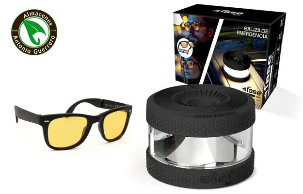 SEÑAL DE EMERGENCIA: Fase Light es un dispositivo de señalización de emergencias en carretera. En caso de sufrir un accidente o una avería, gracias al alcance de su potente luz, esta baliza hace visible tu vehículo averiado para ser visto por otros conductores desde 1 km de distancia y 360º Esta señal luminosa V16 cumple con los requisitos de homologación que exige la Dirección General de Tráfico, incluida la conexión que permite avisar de la posición del incidente, de forma totalmente anónima, durante 2.30h. Con este sistema la DGT alertará a otros conductores para que tomen precauciones al pasar por tu ubicación. eSIM ANÓNIMA: Este dispositivo incluye un plan de datos de Telefonica Tech de más de 12 años de validez, hasta el 1 de enero de 2038. Cuenta con una tarjeta virtual de datos incorporada que es completamente anónima y te permitirá estar conectado solo para alertar de incidentes, sin referencias personales. La tecnología Narrow Band de Telefonica le aporta gran cobertura. SUSTITUYE AL TRIÁNGULO: Esta baliza V16 sustituye a los triángulos de emergencia con el objetivo de mejorar la seguridad y evitar el riesgo de atropello en carretera. La baliza Fase Light se coloca sin necesidad de abandonar el vehículo, evitando al conductor invadir la calzada para señalar el incidente y salvando vidas. Gracias a su potente imán queda sujeta al techo del vehículo fácilmente. GAFAS DE CONDUCCIÓN NOCTURNA: Mejora tu visión al volante con estas gafas plegables de conducción nocturna. Reducen la fatiga visual, aumentan el contraste, mejoran la claridad y minimizan reflejos y deslumbramientos. Ideales para una conducción más segura y cómoda en condiciones de poca luz.