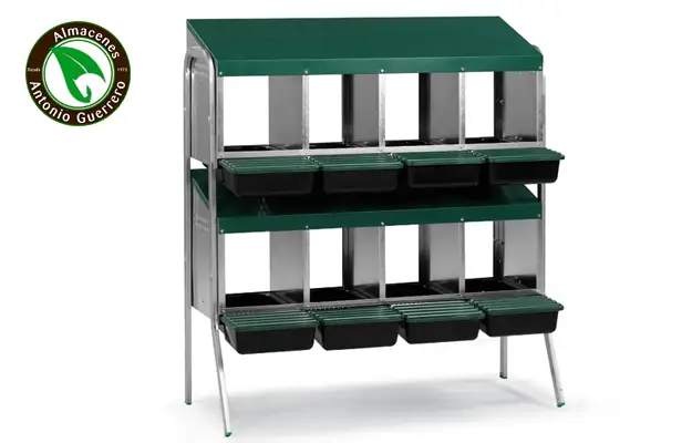 Bateria de ponederos para gallinas de 8 departamentos. Dispone de patas. Fabricado en chapa galvanizada y plástico.