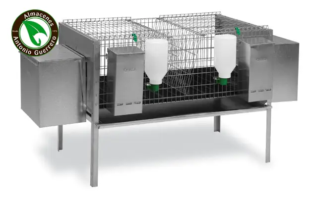 Jaula para conejos de 2 departamentos. Incluye bebederos GAUN con botella, tolvas de 2 huecos con tapa, 2 nidos Espacio con ganchos especiales, forrajera y bandeja colectora. Los laterales son de chapa galva. para cobijar mejor a sus animales. Se envía retractilada y para su montaje NO hacen faltas grapas, sólo algunos tornillos. Se le pueden quitar 1 o 2 nidos sin necesidad de cambiar de jaula.