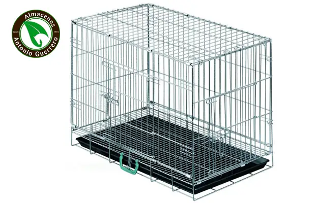 Se trata de una jaula plegable que incluye asa. El suelo incluye una rejilla encima de la bandeja.