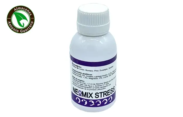 Neomix Stress es una solución oral para el control de los procesos respiratorios y digestivos asociados en aves, bóvidos, conejos y cerdos. Actúa como expectorante y potenciador de la inmunidad para beneficiar el estado de salud del animal. Esta formulación ha sido diseñada para controlar los trastornos asociados al estrés, actuando como antimicrobiano e inmunoestimulante ayudará a incrementar el bienestar animal. Además también favorece el apetito y tiene efecto vermífugo. La administración de este tratamiento se realizará vía oral y puede llevarse a cabo directamente en la boca del animal o mezclado con su agua de bebida.