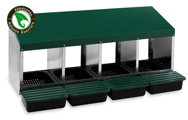 Este ponededero en su presentación de 4 compartimentos, está especialmente diseñado para gallinas y les proporciona una cómoda caja de anidación fabricada en plástico con las piezas laterales galvanizadas. Con este nido fácil de limpiar, sus gallinas tendrán un lugar protegido donde poner sus huevos. Además, el fondo es ligeramente inclinado y asegura que los huevos rueden hacia la bandeja independiente, donde podrá comprobar y recoger los huevos a través de su cubeta. Este nido de puesta para gallinas es realmente imprescindible para todos los entusiastas de los huevos frescos.